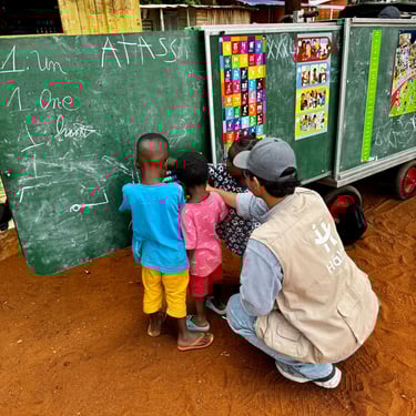 learning activities. As the session continued, additional students from the nearby public school approached the mobile school area and joined the activities out of curiosity. The interaction among different groups highlighted the capacity of the mobile school to bring together children from diverse backgrounds, making it a meaningful tool for integration and sensitization. More than 30 children gathered during the activity, which required substantial effort to distribute attention fairly across all participants. When beneficiary numbers are high, it becomes even more important to reinforce, monitor, and apply PGI principles. The volunteering team must remain particularly aware of risks related to crowd dynamics, child protection, and safe interaction practices.