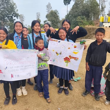 At Maheshwor, Manisha was absent, so we pivoted to a practical "Trash to Art" activity for Chocolate Day. The kids showed great dedication to their environmental goals, choosing to make posters for their cleaning program over Valentine's crafts.