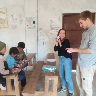 The next morning, we had the surprise of seeing some girls from Kalika come to the center. We listened to music and danced together. We thought we would see them again in the afternoon when we went to Kalika, but many students were absent due to a wedding. We ended up with a small class. As requested by VIN, we worked on the Wall Magazine project. The students created poems, drawings, and short presentations. Afterwards, we introduced them to origami — cranes, tigers, and paper fortune tellers. It was a pleasant session in a smaller group, much calmer than the previous week.